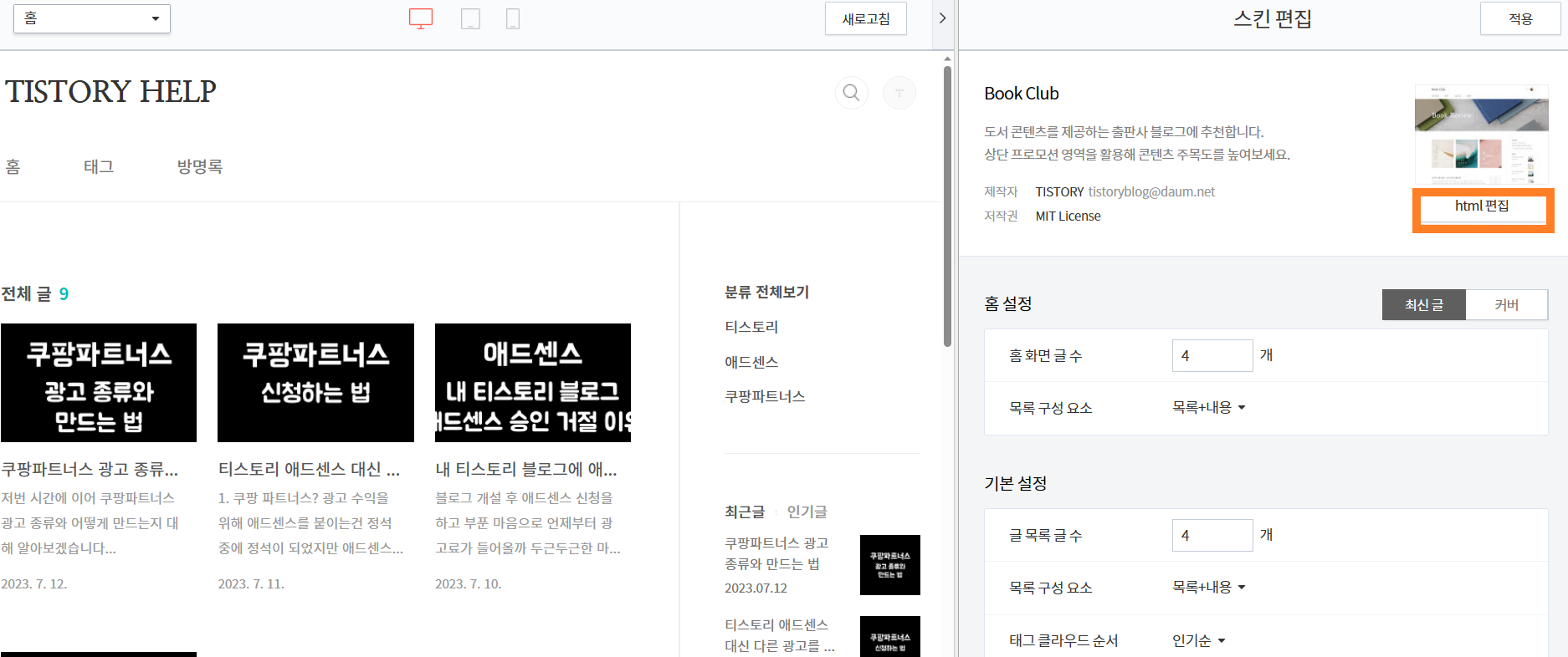 스킨편집창에서 우측 상단에 있는 html 편집창을 눌러줍시다