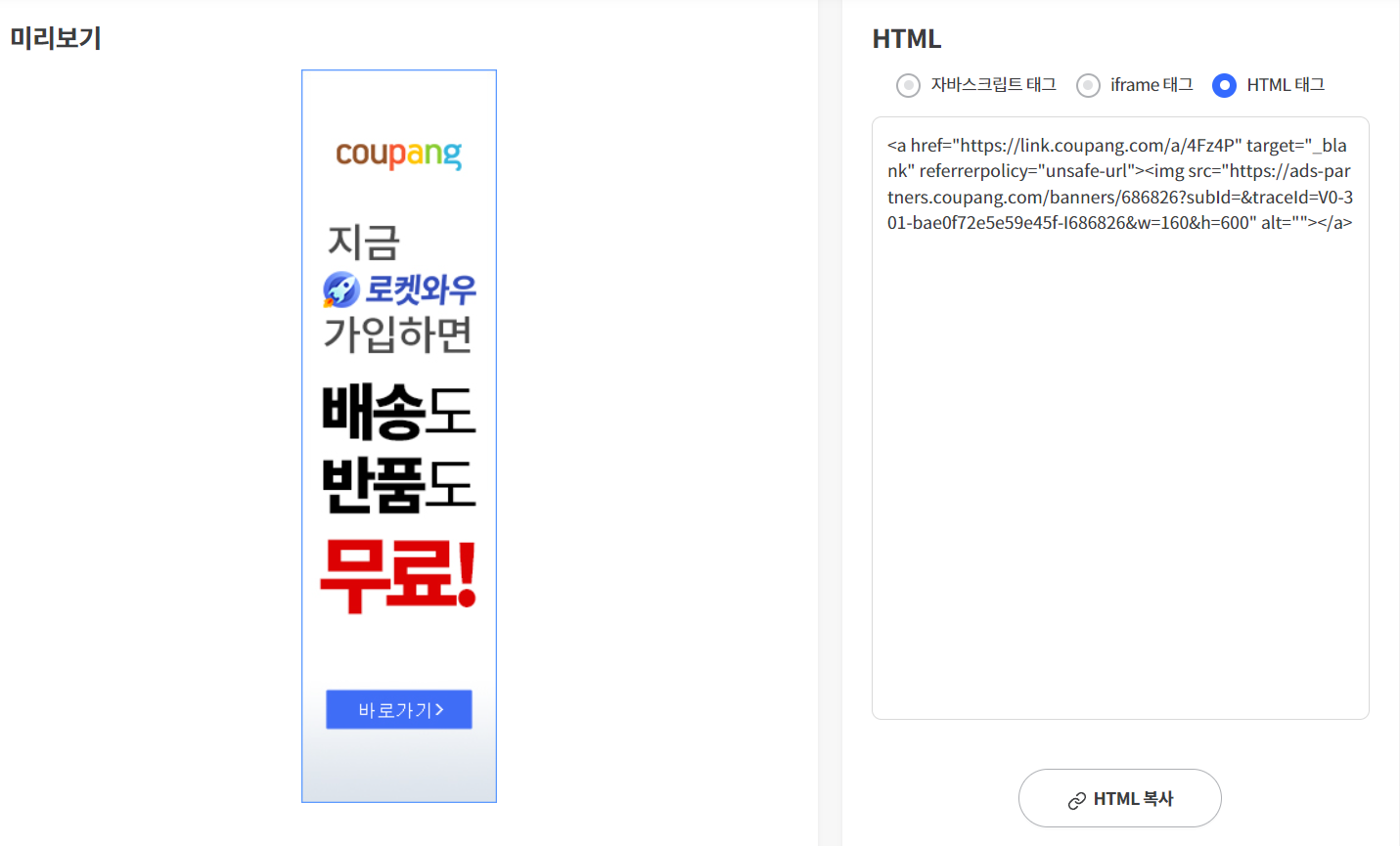 배너를 클릭하면 사이즈에 맞는 이미지를 미리보기로 확인할 수 있고 옆에 html 코드가 나옵니다