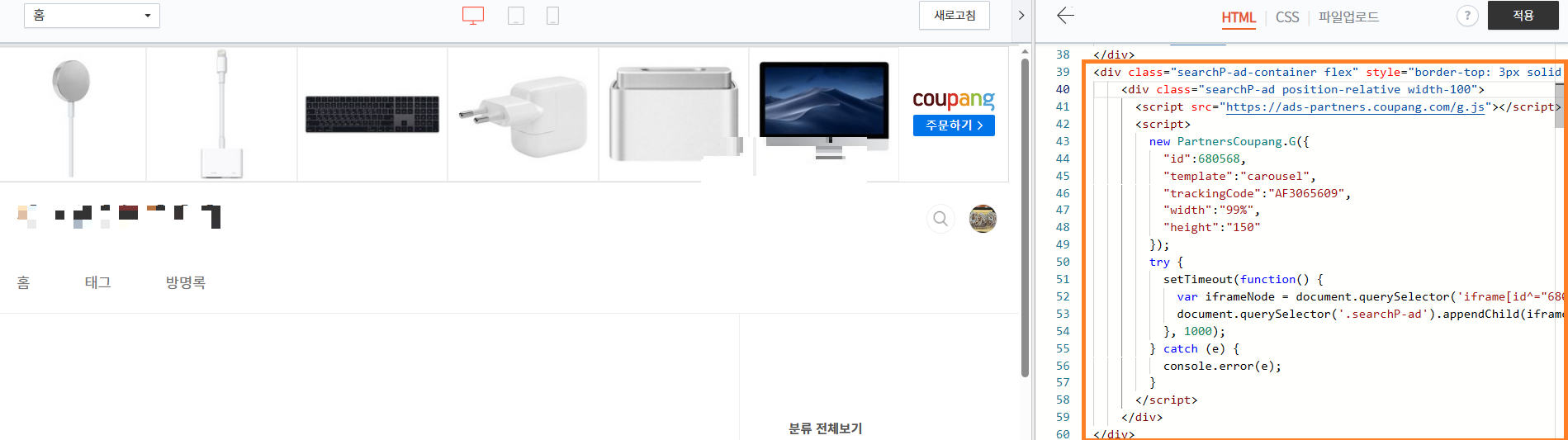 아까 쿠팡파트너스 사이트에서 복사한 HTML 코드를 그대로 넣어줍시다
