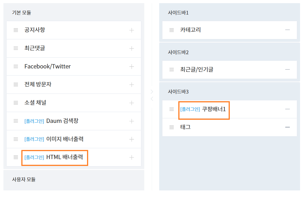 제가 보여준 예시에서는 사이드바3에 넣고 배너 이름을 쿠팡배너1로 편집해 놓았어요