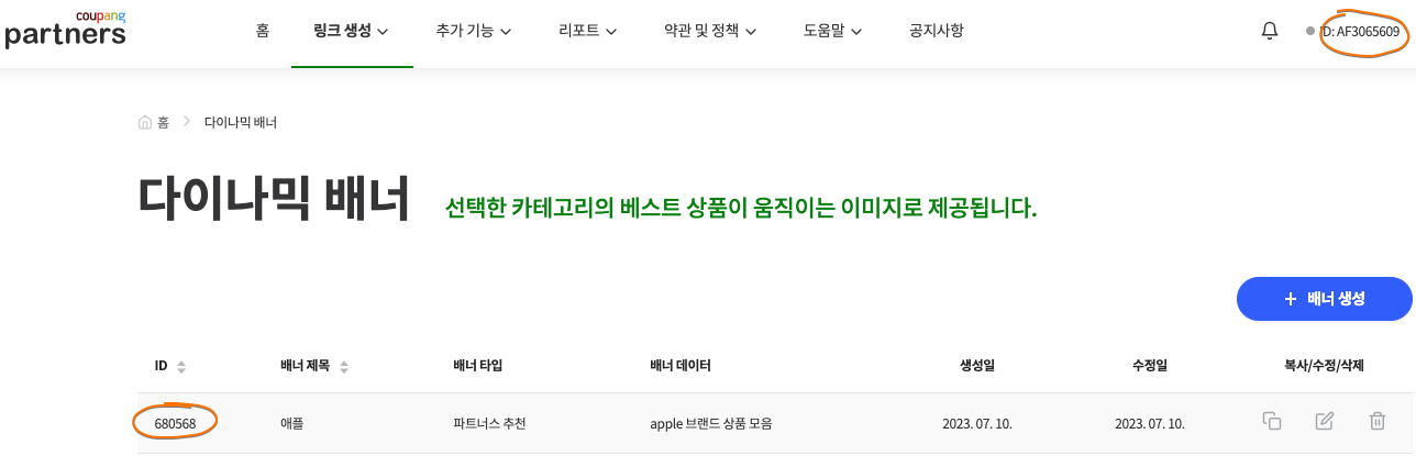 먼저 쿠팡파트너스 사이트에서 링크 생성 -> 카테고리 배너를 눌러서 원하는 카테고리를 클릭해 주세요