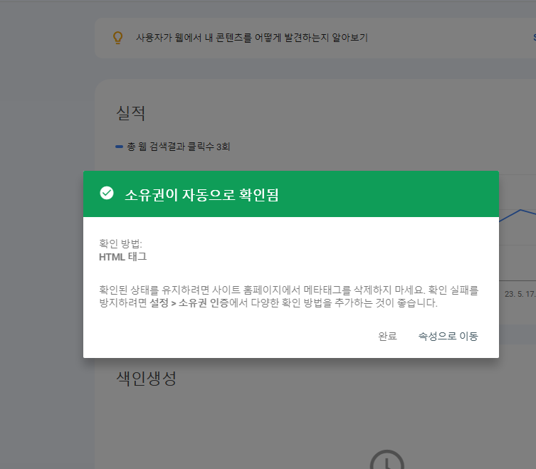이제 좀 전에 구글 서치 콘솔로 가서 확인 버튼을 누르면 소유권이 확인 되었다는 창이 뜹니다.