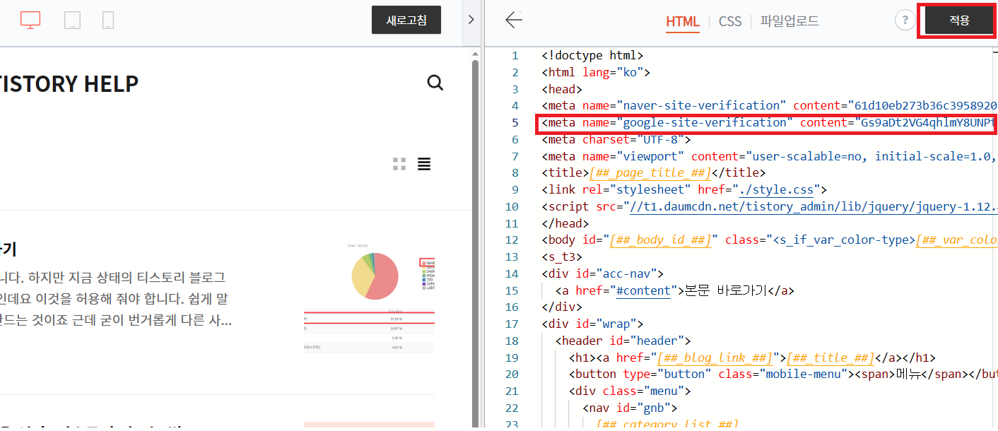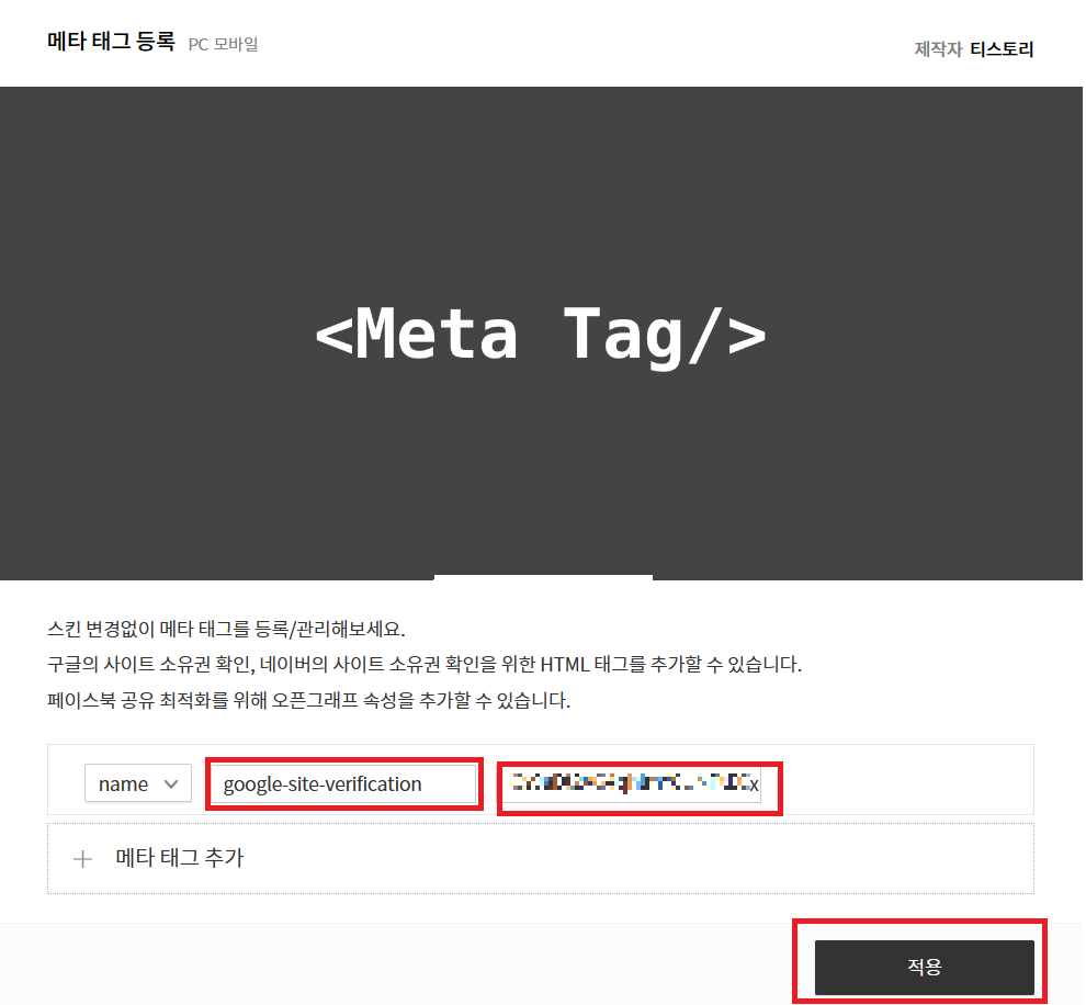 google-site-verification을 입력 후 content값을 입력한 다음 적용 버튼을 누르면 끝!
