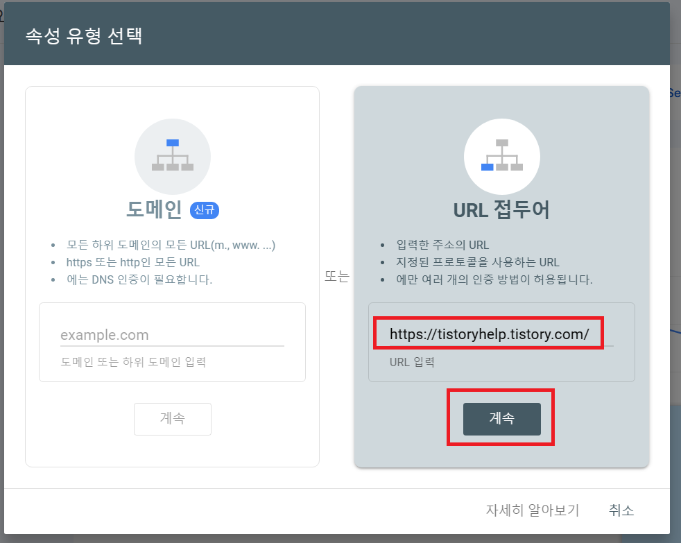 구글 계정 로그인 후 위와 같은 창이 뜨는데 내 블로그의 주소를 입력 후 계속 버튼을 누릅니다.
