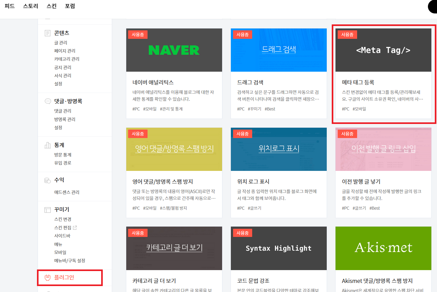 플러그인 중 <Meta Tag/>를 찾아서 클릭하면 되는데요, 처음이시라면 사용중이라는 표시가 없을겁니다.