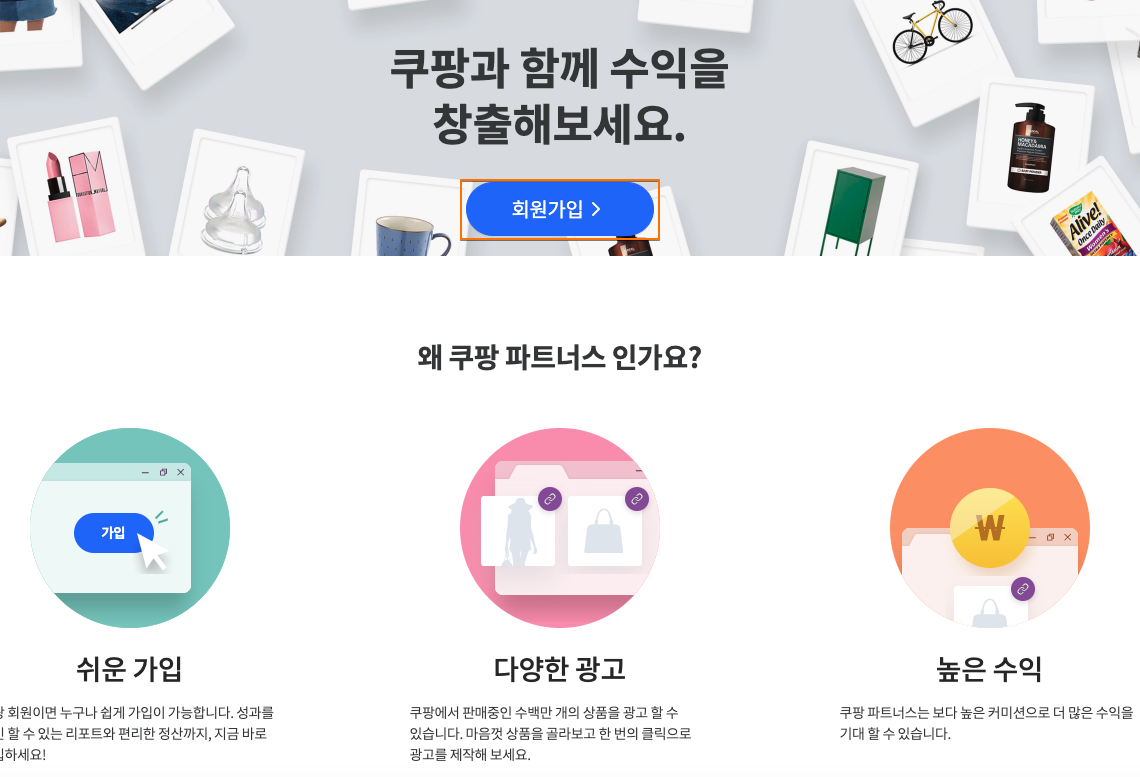 먼저 쿠팡파트너스 홈페이지에 들어가야 합니다.