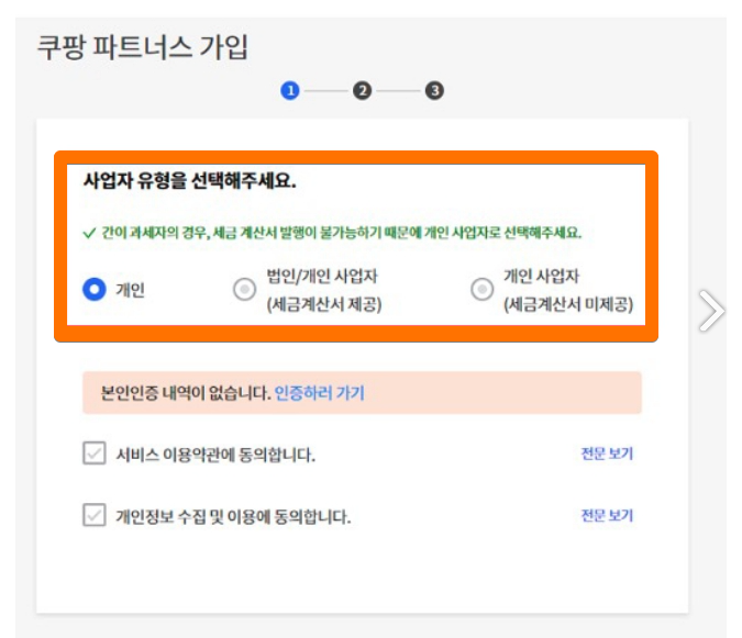 사업자 유형은 개인, 나머지 약관은 동의하고 다음으로 넘어갑니다