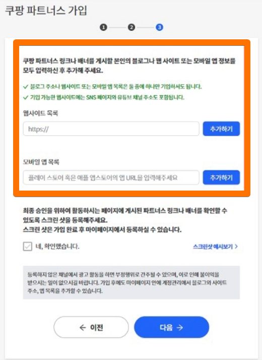 여기까지 하셨으면 벌써 쿠팡파트너스의 가입이 끝난겁니다